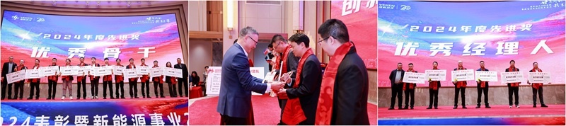 随后,2024 年度先进表彰环节正式拉开帷幕。“最佳师徒”、“优秀员工”、“标杆班组”、“优秀骨干”、“优秀经理人” 以及 “创新突破事件/团队” 等多个奖项一一揭晓。获奖者们凭借2024年突出业绩和价值贡献,赢得了各项先进荣誉,他们走上领奖台,手捧奖杯和锦旗成为全场瞩目的焦点,也为全体员工树立了学习的榜样。