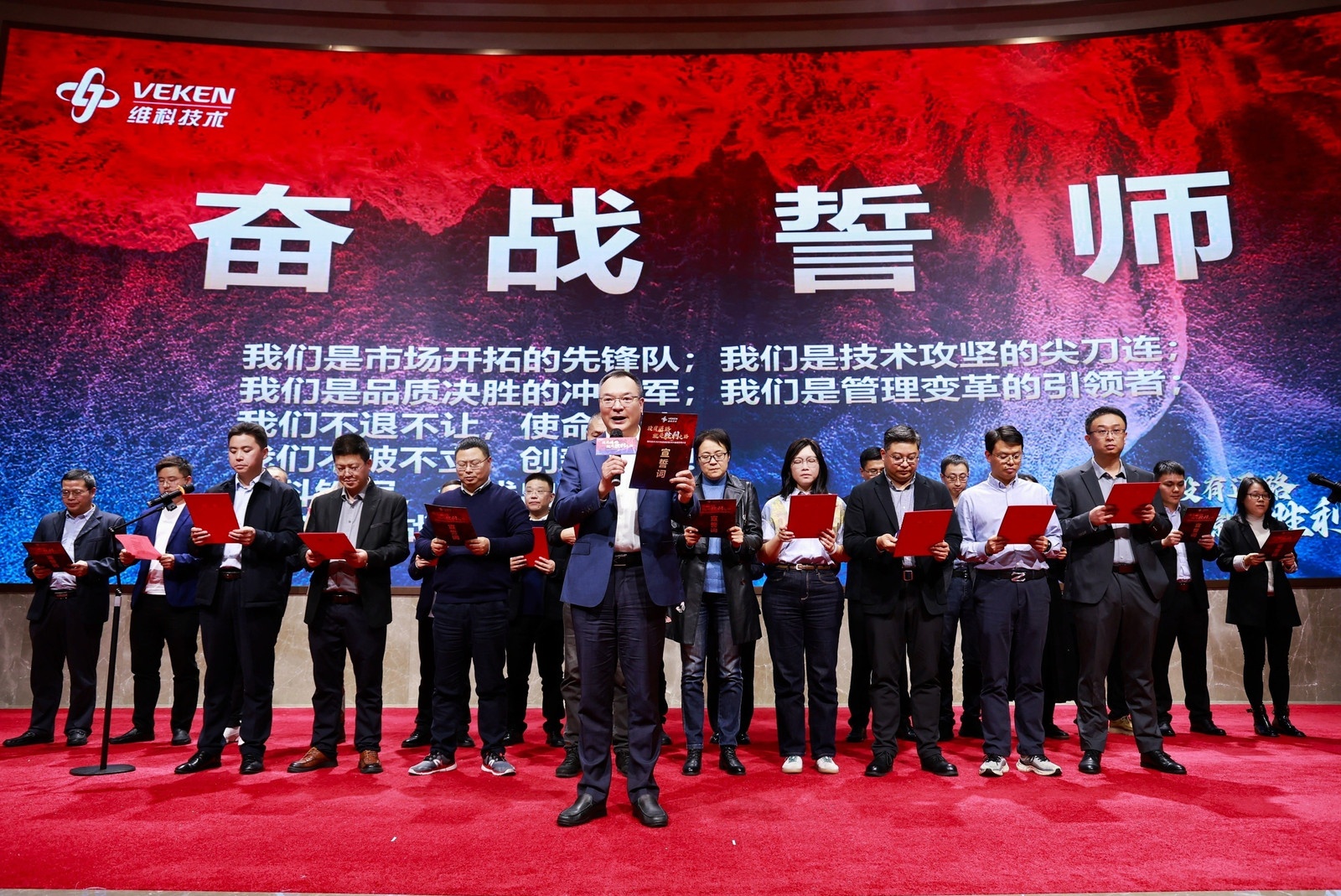 紧接着,在陈董事长的带领下,股份公司领导班子与新聘主要干部集体肃立,高举右拳,进行奋战宣誓。台下全员肃然起立,齐声跟诵,激昂有力的誓言如雷回荡,汇聚成beats365·(中国区)唯一官方网站人决胜2026的钢铁意志与集体信念。